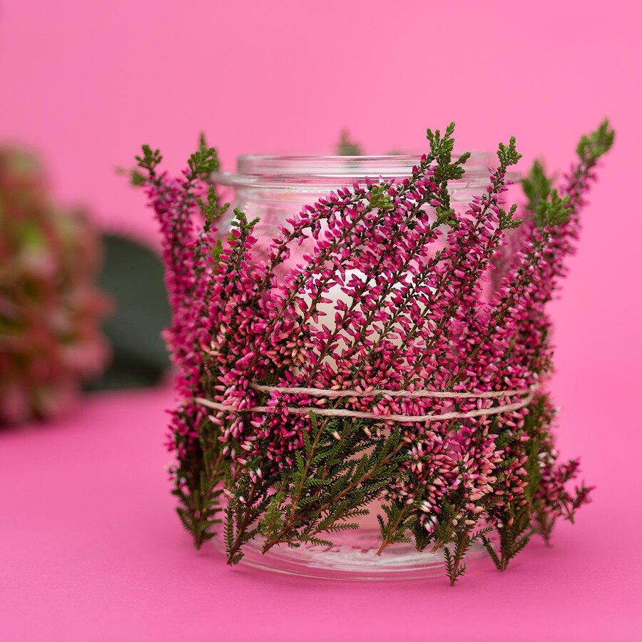Zum Beispiel, indem man LED-Windlichter mit Herbstlaub und einer einfachen Schnur umwickelt. Oder dicke weiße Kerzen in ein großes Glas und außen herum blühende Schneeheide binden oder lila Erikazweige oder schöne Gräser mit kleinen, bunten Puscheln …