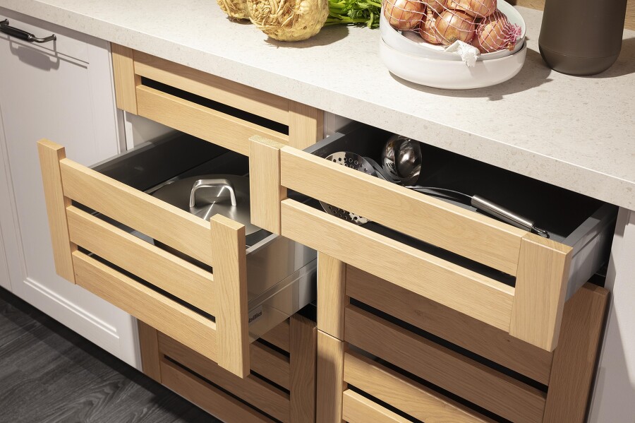 Im gezeigten Küchenbeispiel sind es offene Züge aus Echtholz, die Landhausflair mit sich bringen und nebenbei auch noch sehr praktisch sind: Im Stil englischer Züge gestaltet bieten sie genau so viel Einblick, um schon von außen sehen zu können, was hier verstaut wurde. Zugleich verdecken sie das Innere des Auszugs gerade so viel, damit keine unordentliche Optik entsteht. Nicht zuletzt benötigen diese Art Auszüge keine Beschläge, weil sie von Haus aus Grifflücken besitzen.